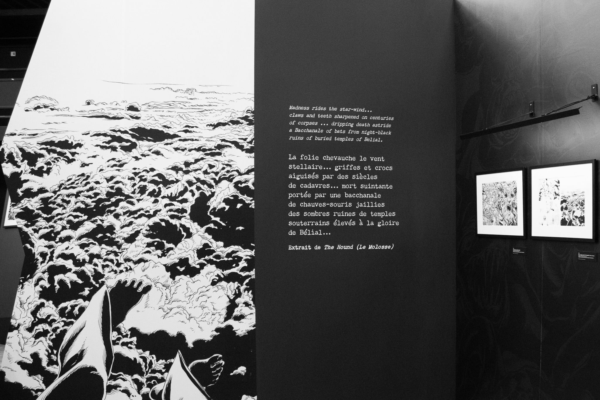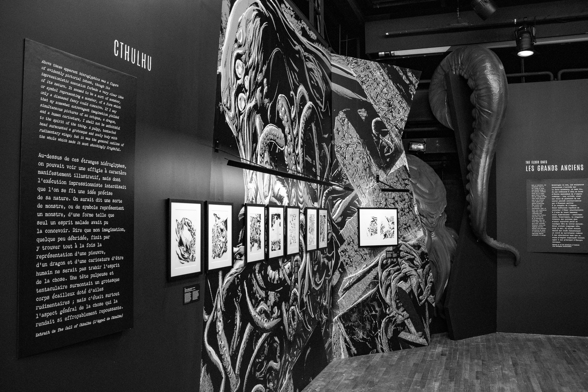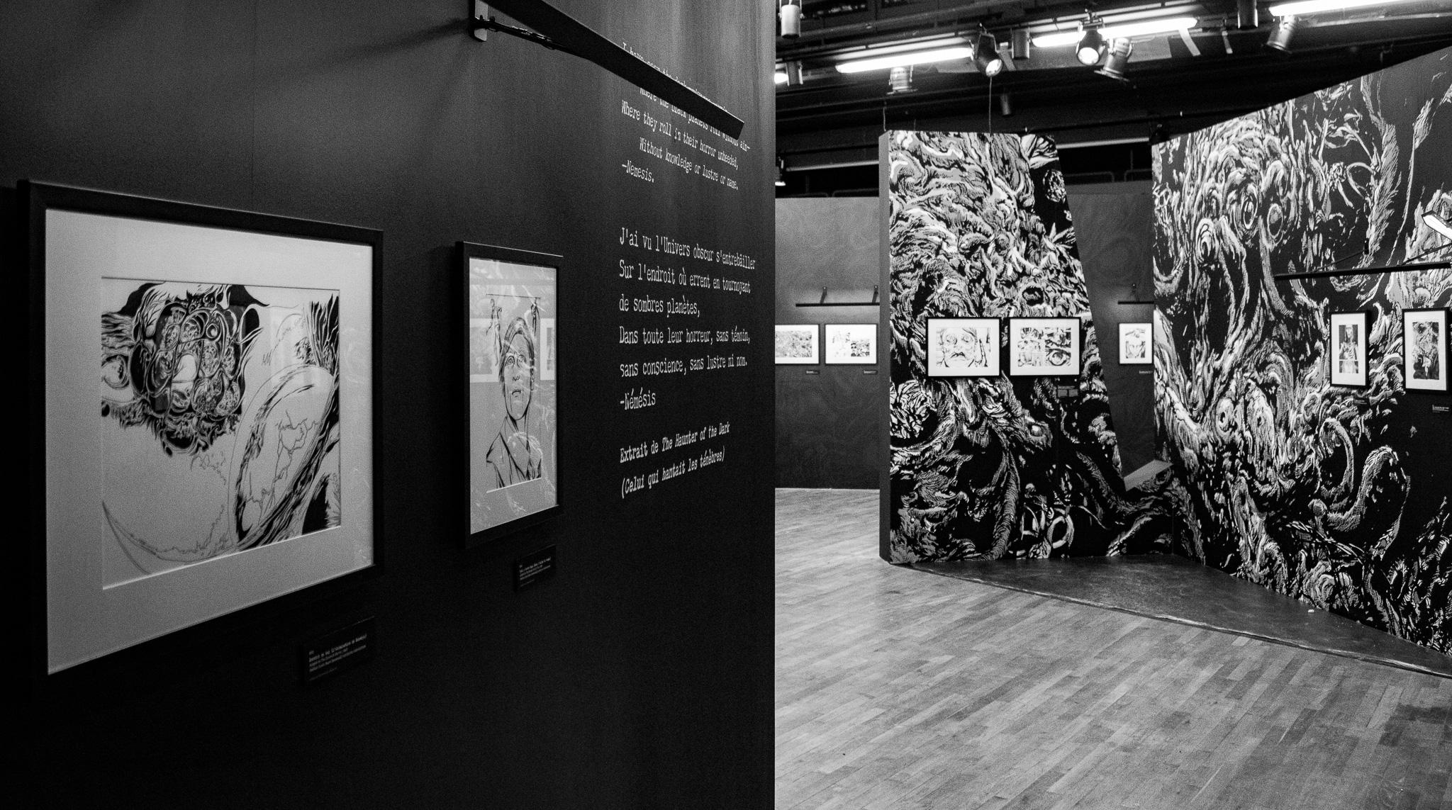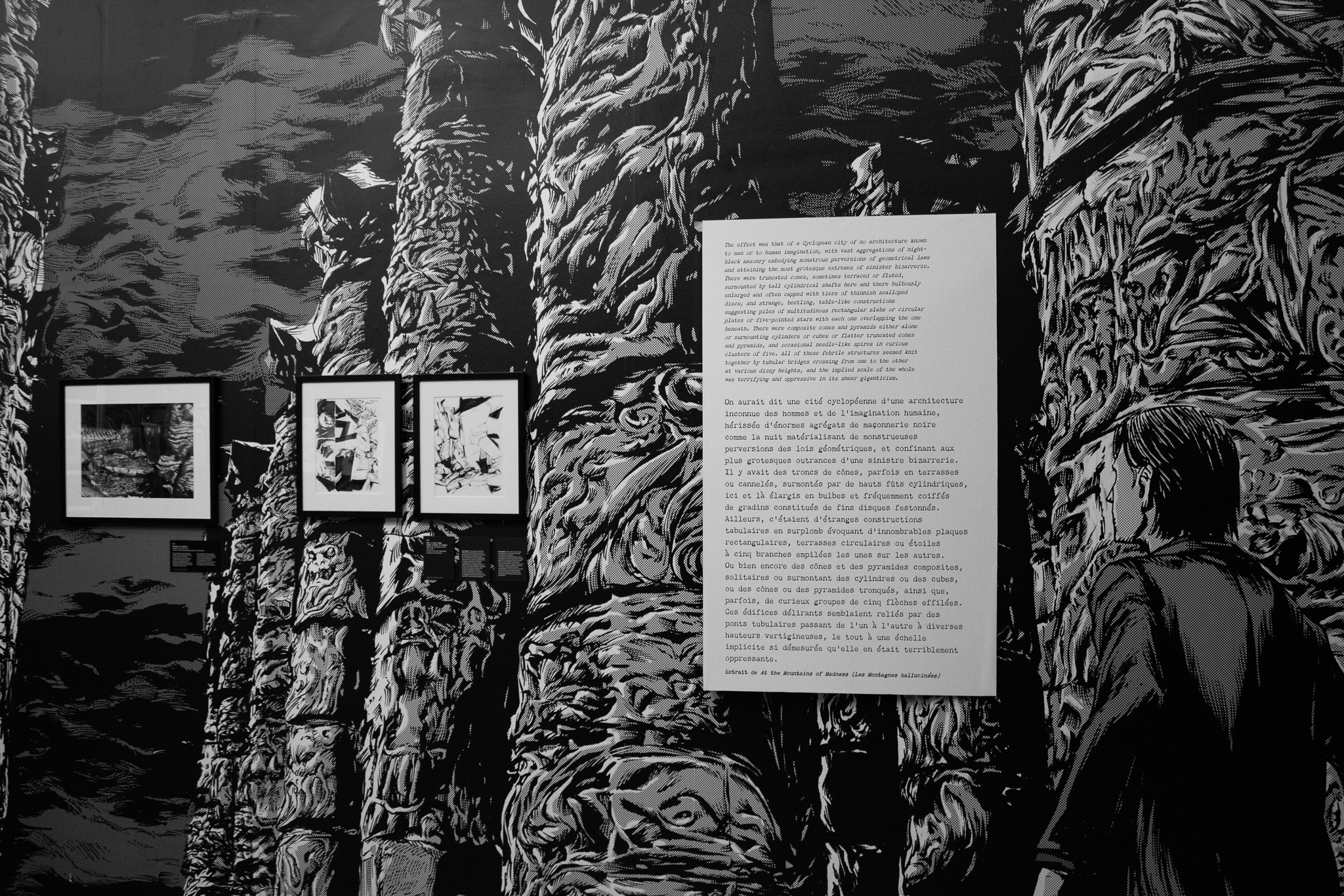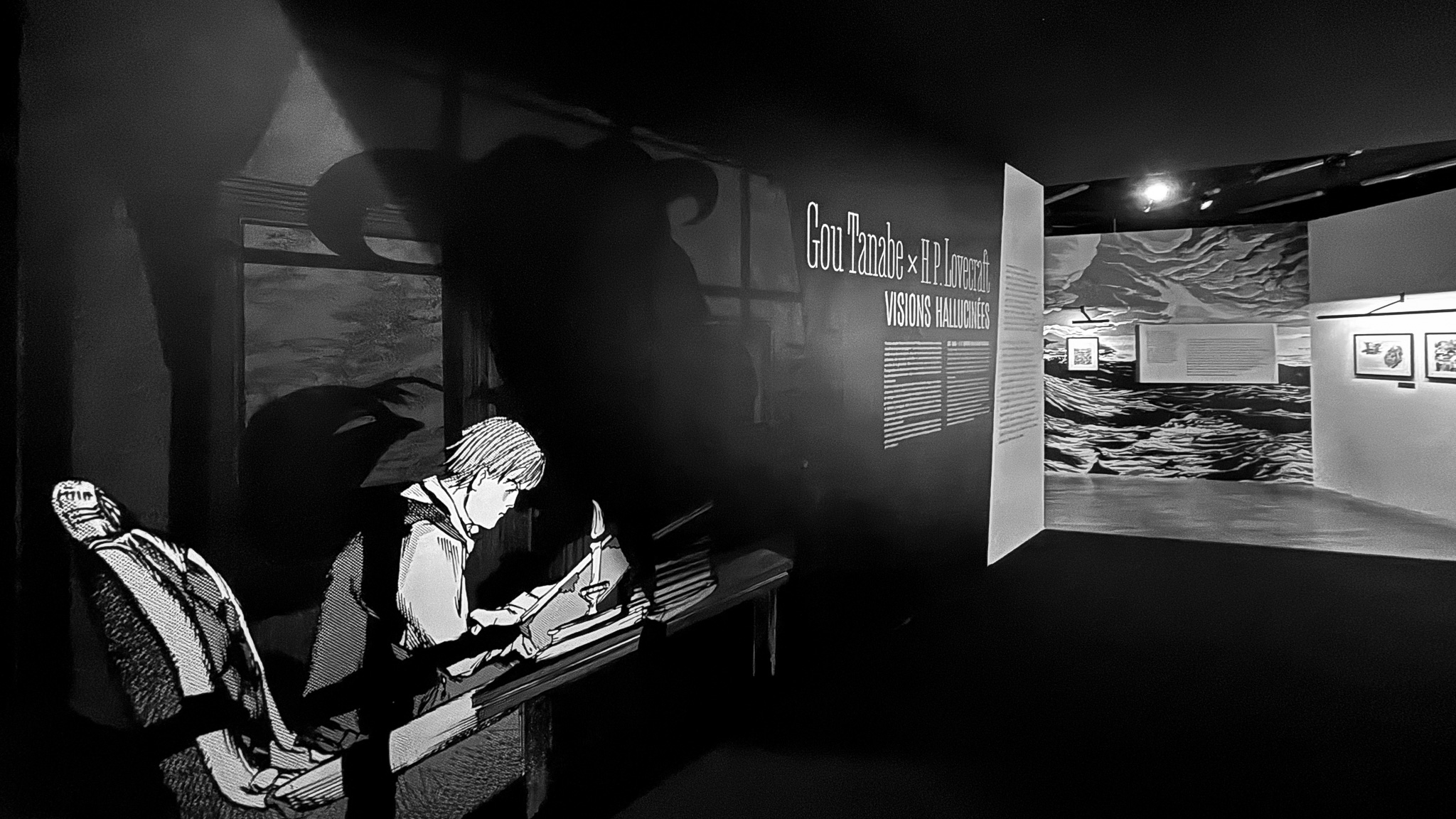 À travers de plus d’une centaine de dessins originaux présentés dans une scénographie cyclopéenne et accompagnés d’extraits du texte séminal, les visiteur·se·s pourront découvrir les méthodes de travail de Gou Tanabe (mêlant dessin traditionnel sur papier et outil numérique), ainsi que ses interprétations des grandes figures des récits de l’auteur fantastique le plus influent du XXe siècle. La sélection de planches présentées s’étendra de la première incursion du mangaka dans l’univers de H.P. Lovecraft avec The Outsider en 2004, jusqu’au cycle consacré au personnage de Randolph Carter qu’il a récemment entamé. Architectures inquiétantes, figures dérangeantes et atmosphères étouffantes seront au rendez-vous.