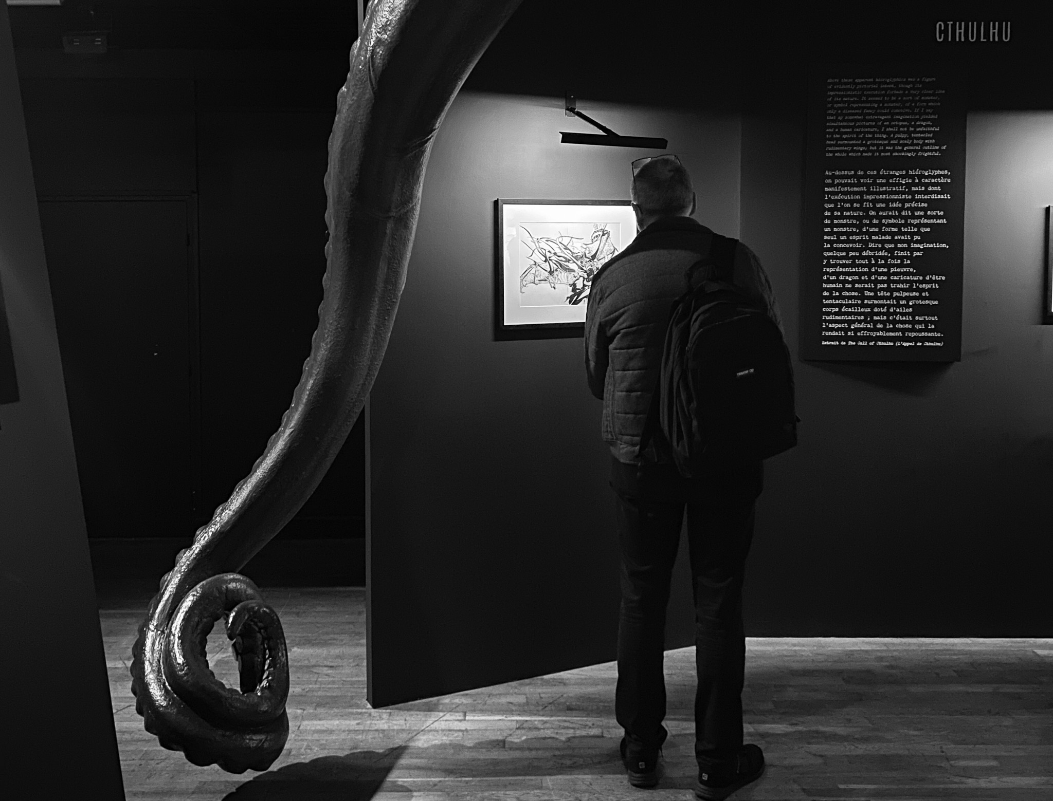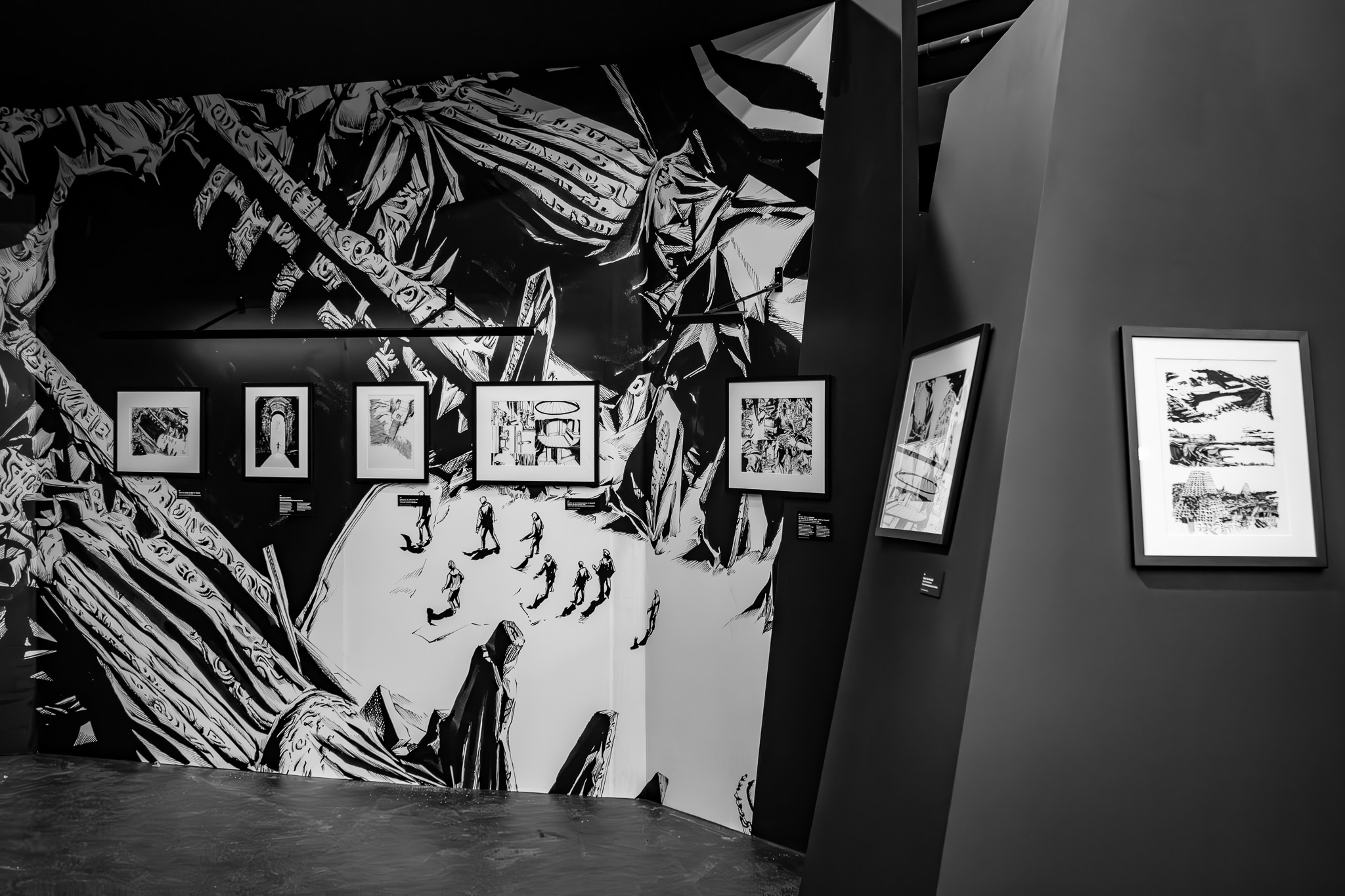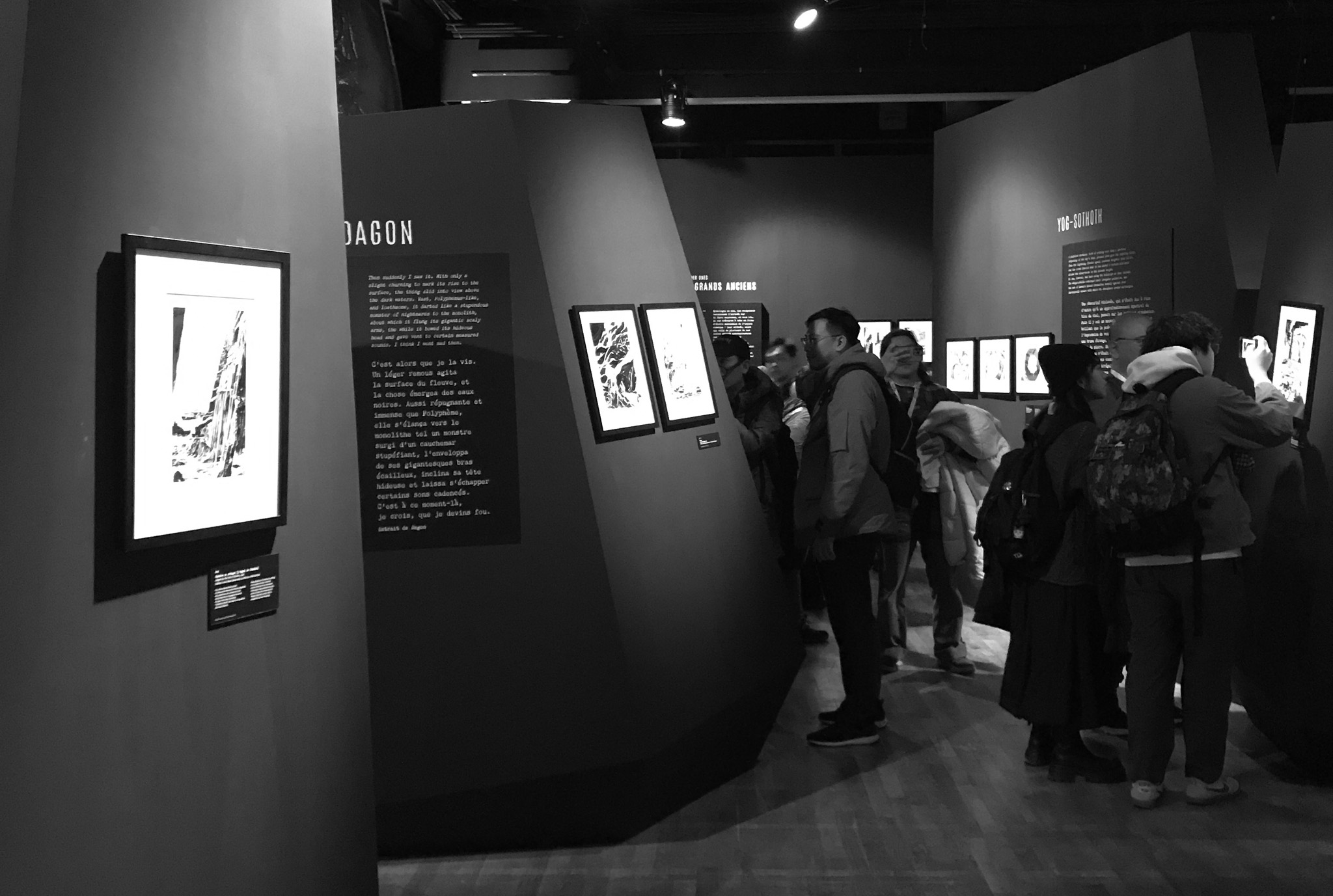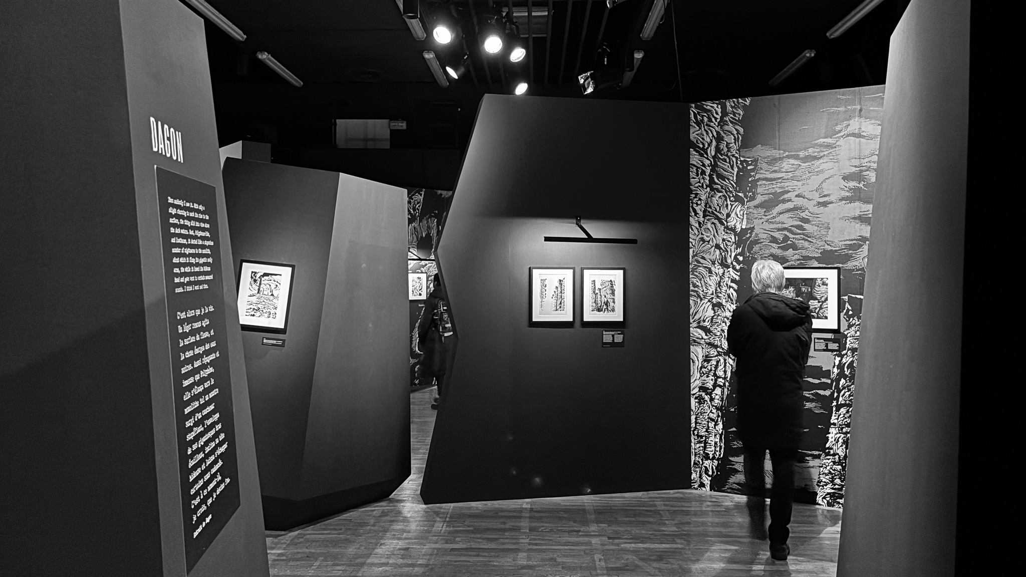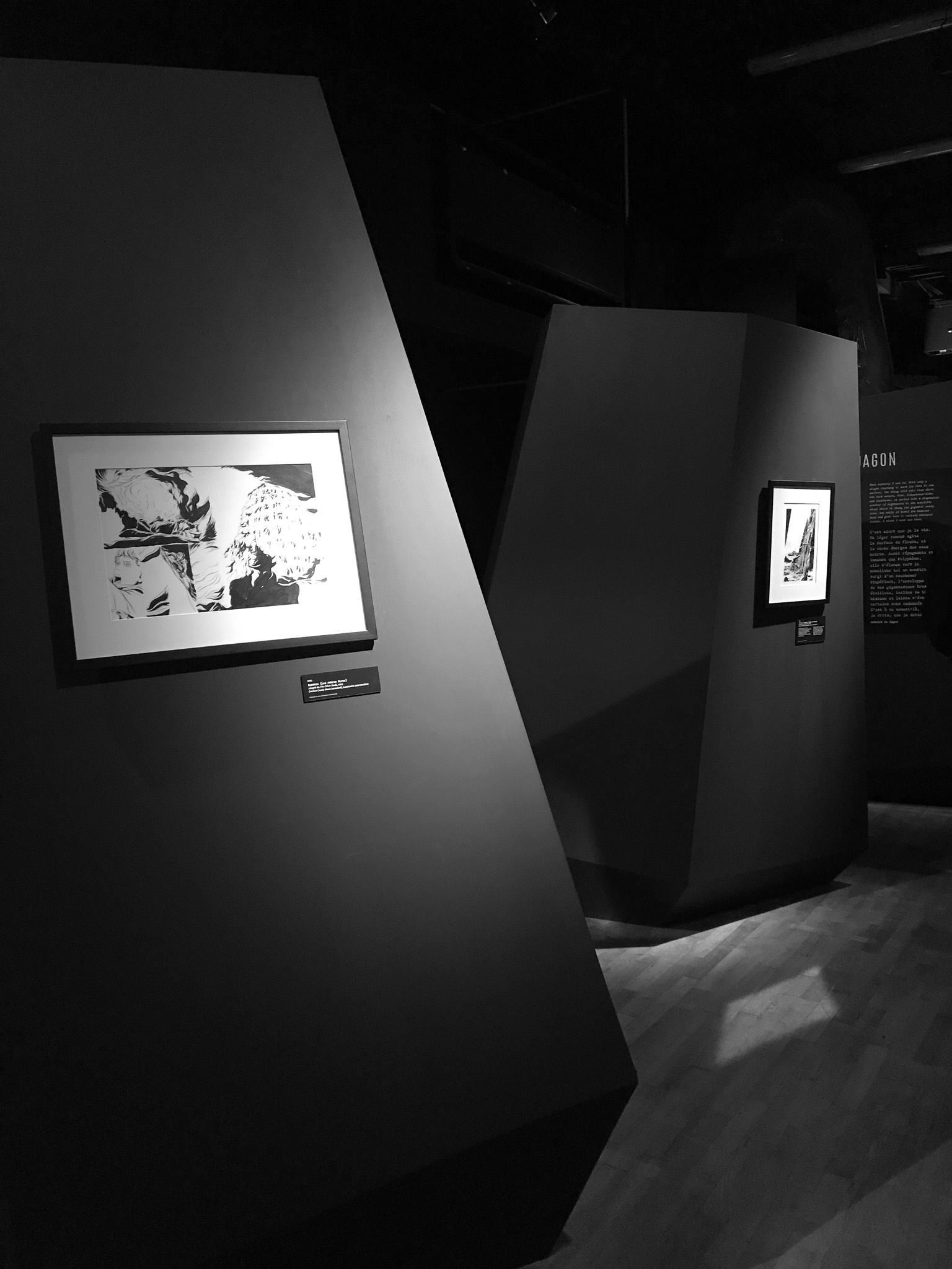 À travers de plus d’une centaine de dessins originaux présentés dans une scénographie cyclopéenne et accompagnés d’extraits du texte séminal, les visiteur·se·s pourront découvrir les méthodes de travail de Gou Tanabe (mêlant dessin traditionnel sur papier et outil numérique), ainsi que ses interprétations des grandes figures des récits de l’auteur fantastique le plus influent du XXe siècle. La sélection de planches présentées s’étendra de la première incursion du mangaka dans l’univers de H.P. Lovecraft avec The Outsider en 2004, jusqu’au cycle consacré au personnage de Randolph Carter qu’il a récemment entamé. Architectures inquiétantes, figures dérangeantes et atmosphères étouffantes seront au rendez-vous.
